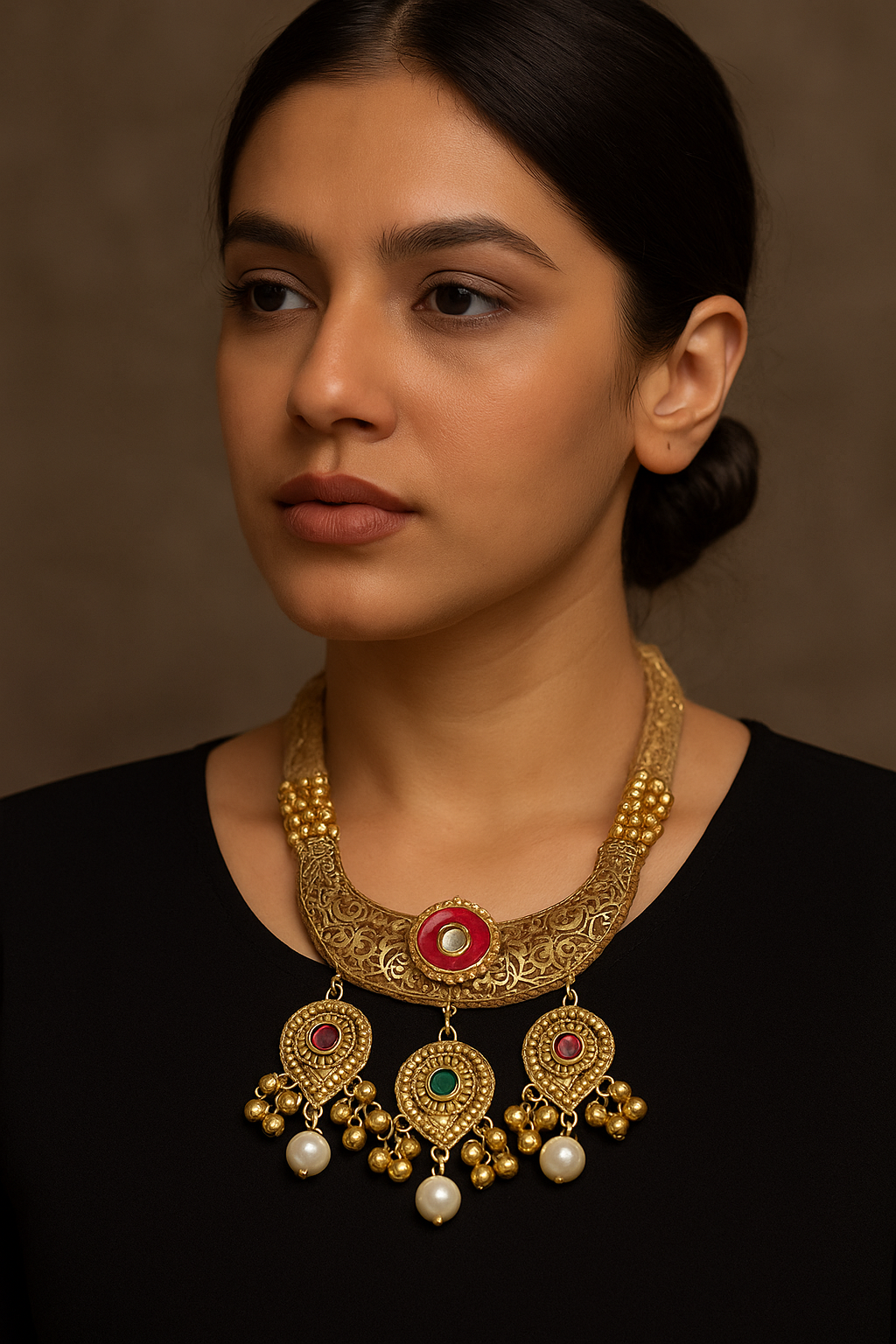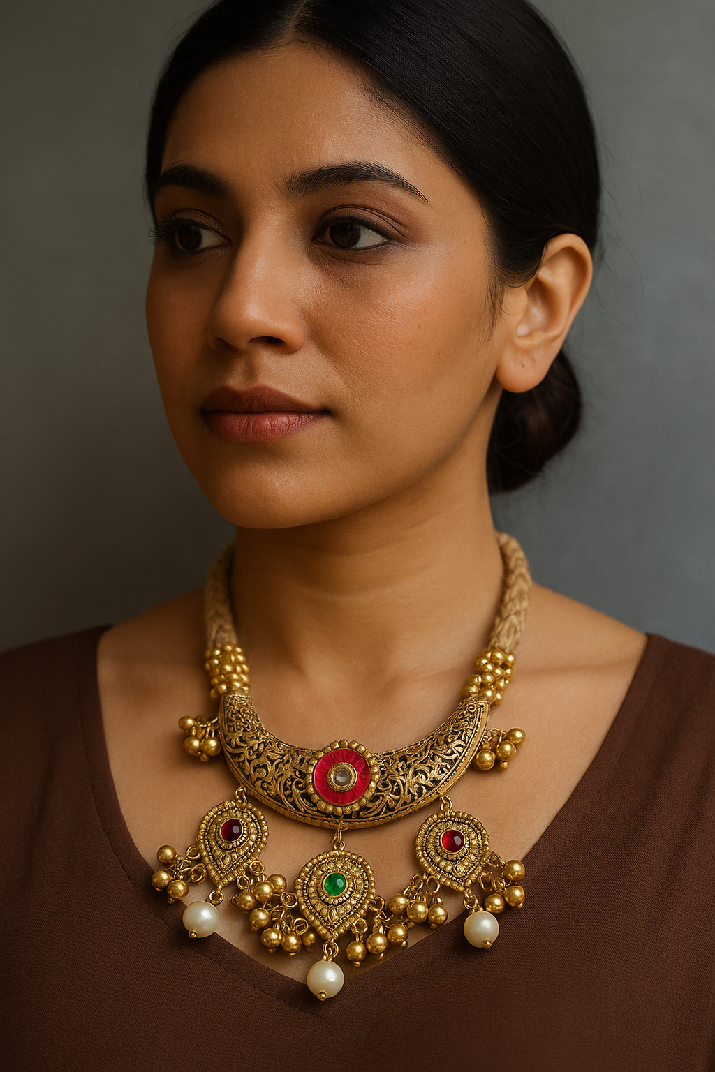 Made with braided jute and detailed golden motifs, this necklace brings traditional charm in a natural way.