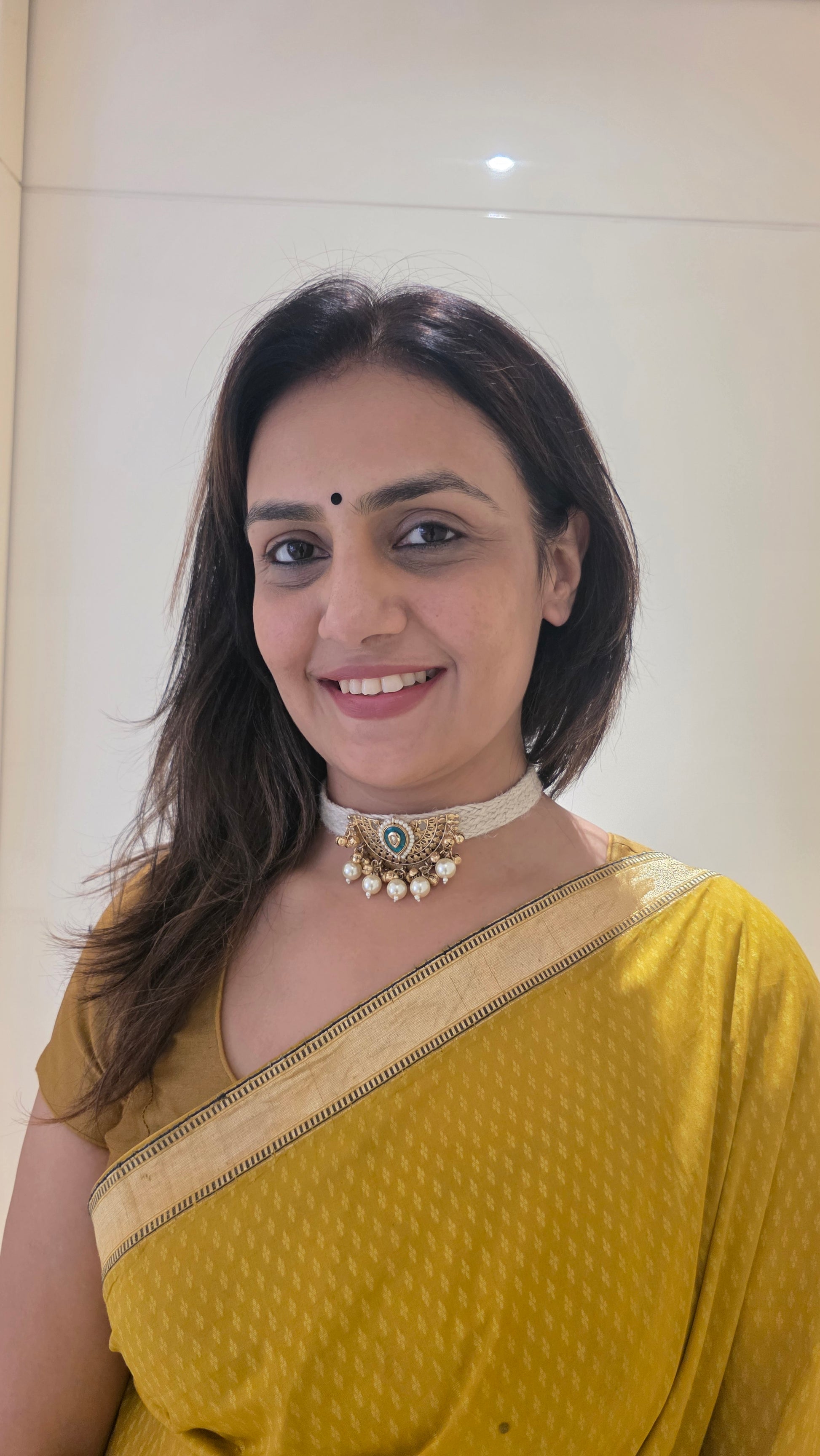 A handcrafted jute choker from our Wedding Collection, featuring a delicate gold-toned pendant with enamel detailing and pearl drops. The soft, woven jute base sits comfortably on the neck, blending earthy elegance with traditional charm.