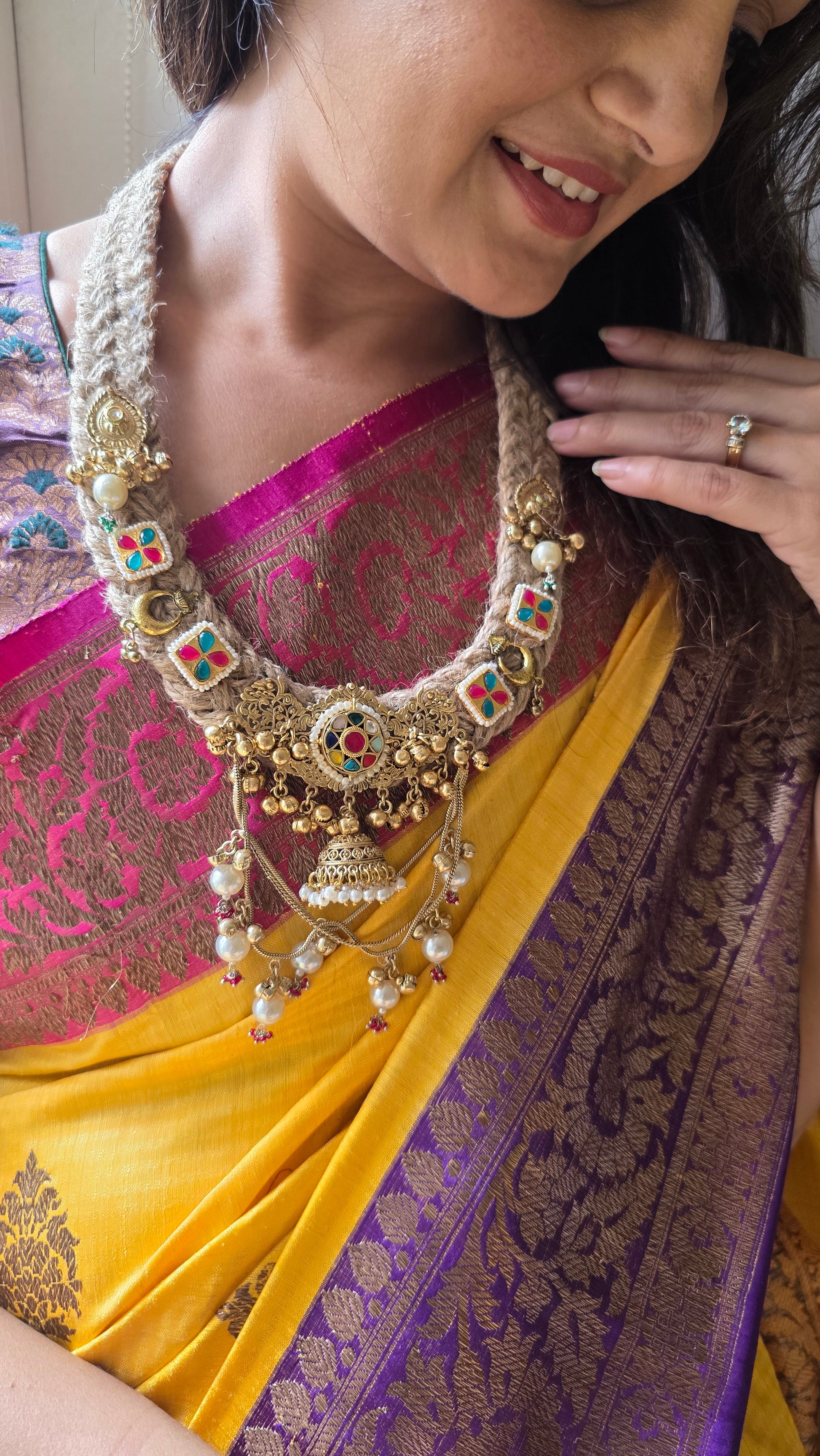 A handcrafted jute wedding neckpiece designed with intricate knots, colourful meenakari motifs, and elegant gold-toned detailing. Finished with hanging pearls and delicate chains, this statement piece blends tradition with earthy charm. Lightweight, skin-friendly, and perfect for bridal and festive wear, it adds a royal touch to every saree and lehenga.