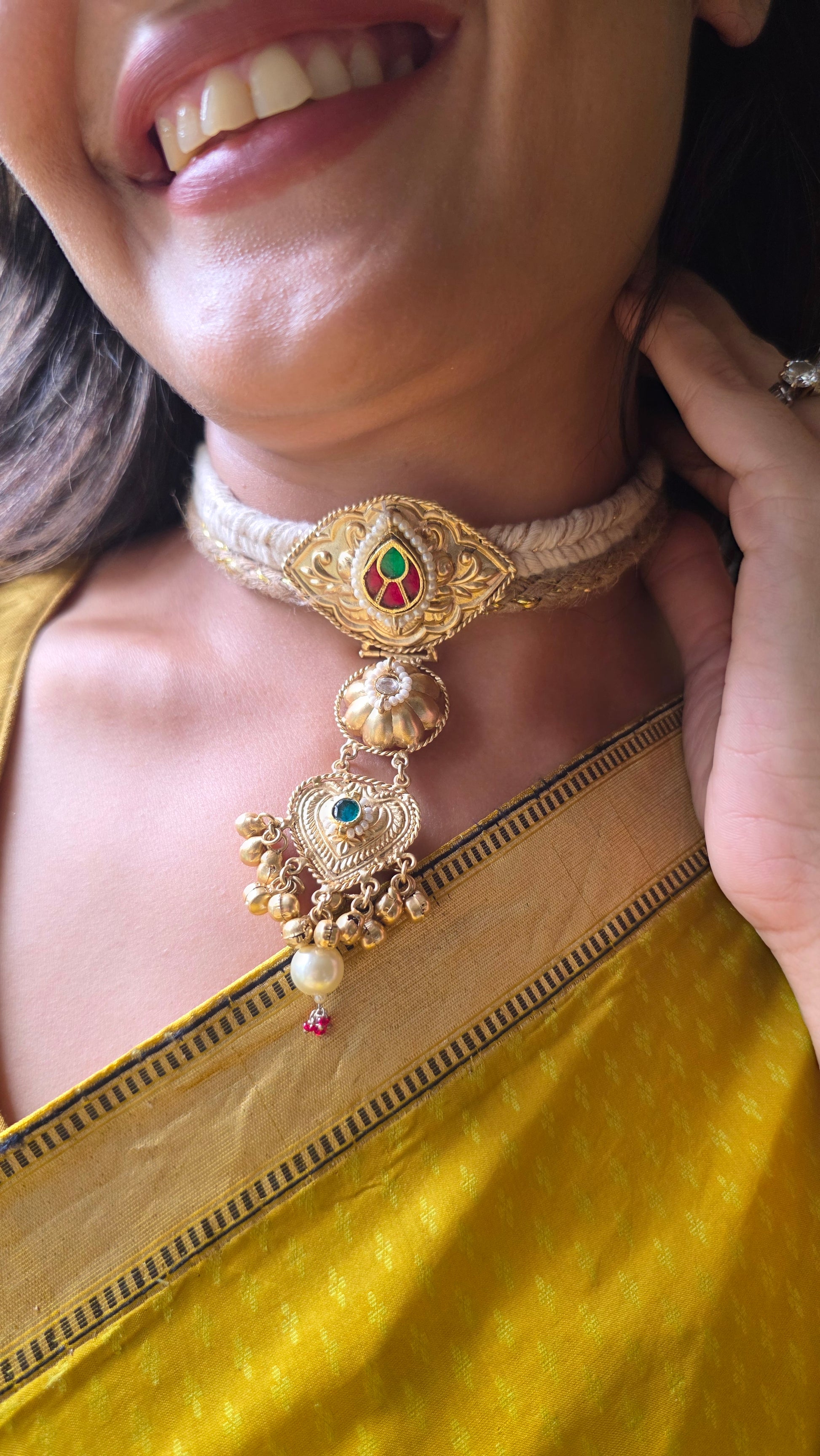 A handcrafted jute choker from our Wedding Collection, featuring an intricate gold-toned central motif with vibrant enamel work. The design flows into a beautiful layered pendant adorned with pearls and delicate drops. Lightweight and rich in traditional charm—perfect for brides and festive occasions to add a royal touch to any ethnic outfit.