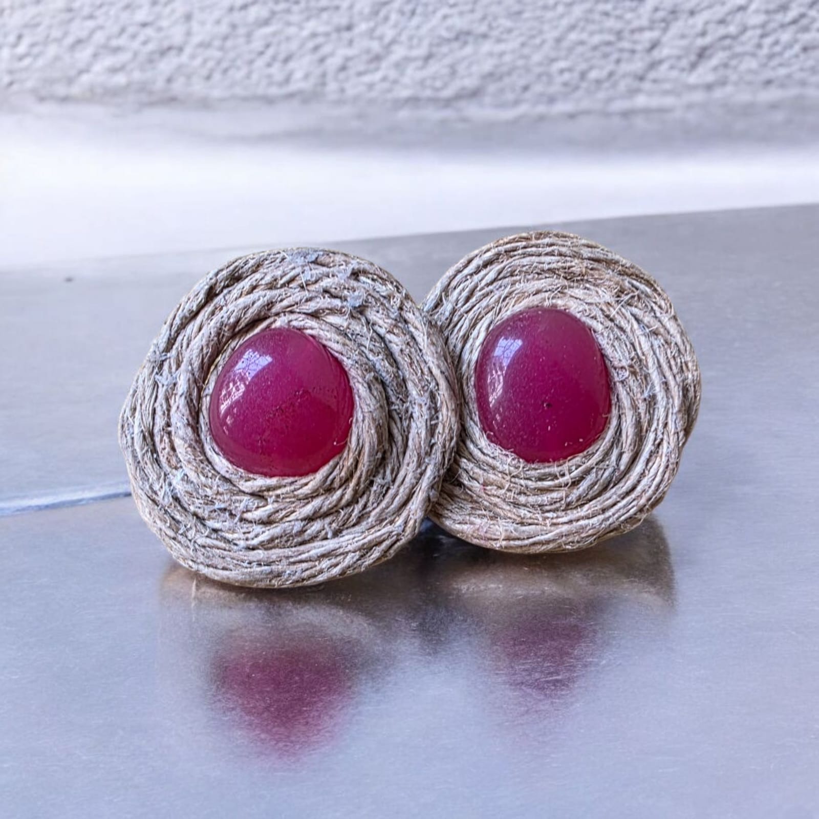 Handcrafted jute stud earrings featuring a neatly coiled circular design with a bold pop of deep pink at the center. Lightweight, earthy, and stylish, these earrings bring together natural texture and vibrant colour—perfect for both everyday wear and contemporary festive looks.