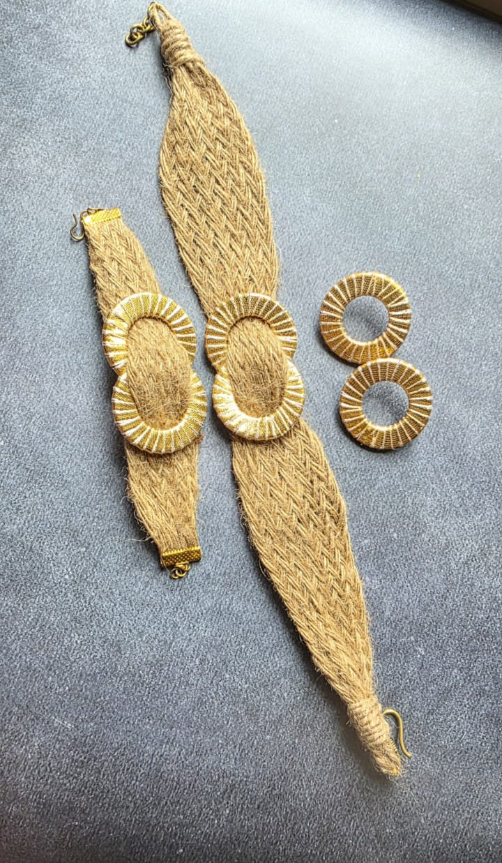 A handcrafted jute wedding neckpiece featuring a beautifully woven broad jute band paired with elegant gold-toned circular highlights. Lightweight, earthy, and richly textured, this piece blends traditional charm with contemporary design
