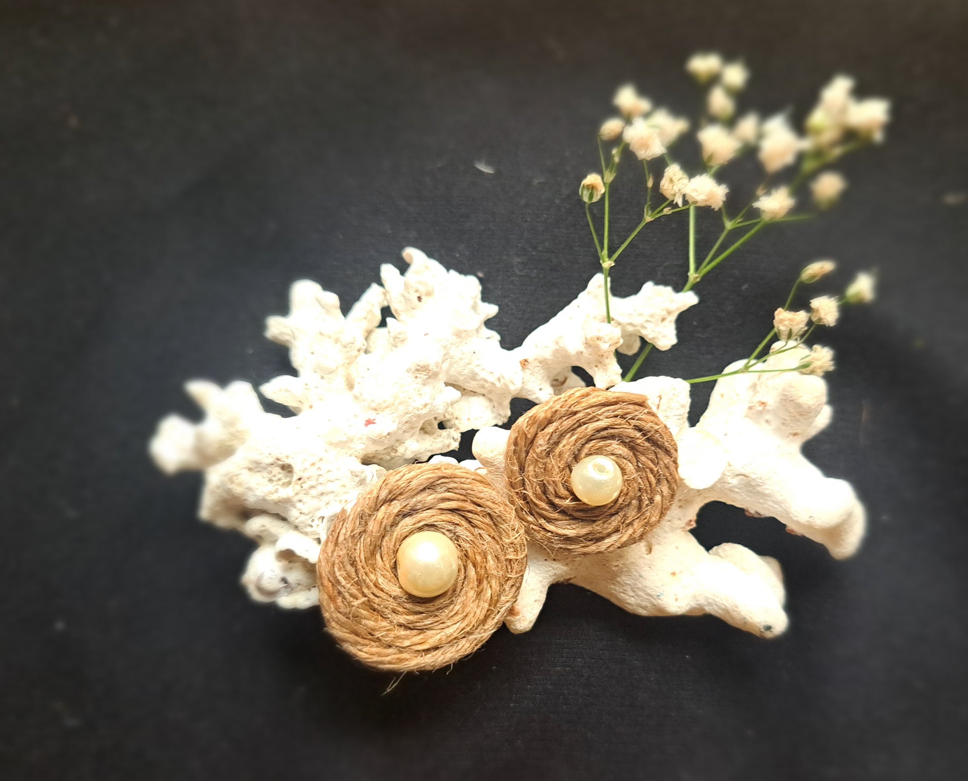 These spiral jute earrings feature a smooth natural weave topped with a soft pearl. A blend of earthy beauty and graceful charm—ideal for subtle statement styling.