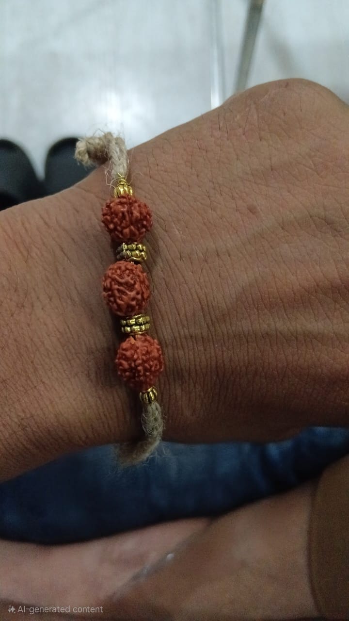 A handcrafted jute men’s band featuring three natural Rudraksha beads and golden spacers. Light, earthy, and comfortable for daily wear—perfect for those who prefer a spiritual yet stylish accessory.