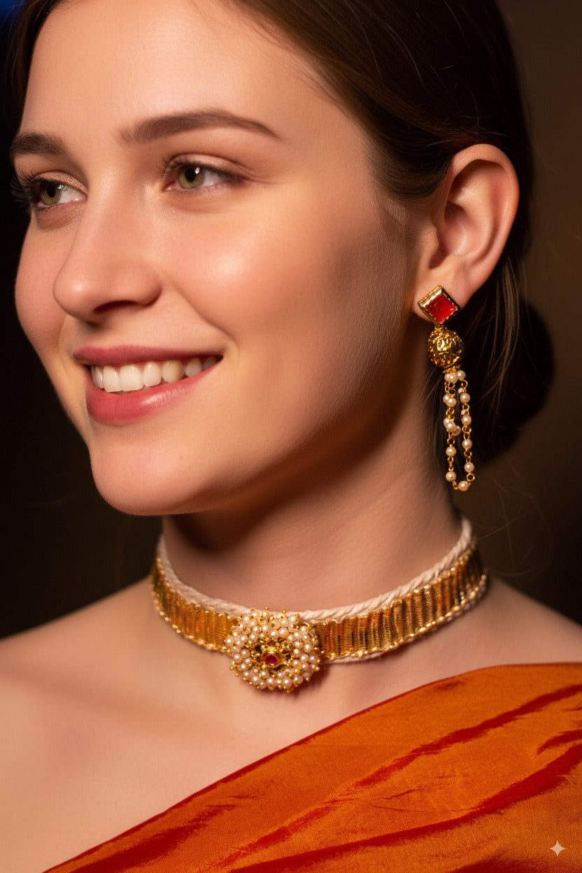 A premium jute choker featuring a golden gota strip and a pearl–red stone floral motif. Lightweight, skin-friendly, and ideal for weddings and festive looks.