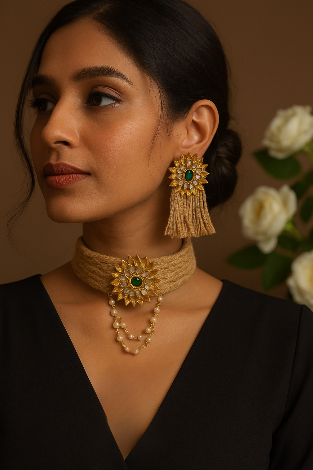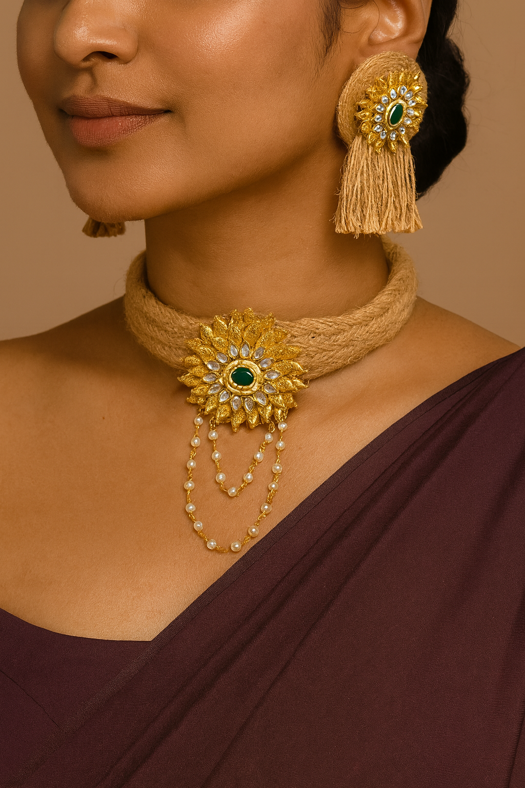 The choker is intricately wrapped in natural jute threads, featuring a sunburst motif at its center, embellished with emerald-green stones surrounded by delicate mirror and pearl detailing, giving it a regal yet earthy charm.